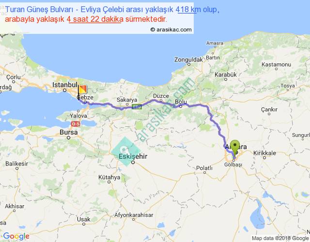 Turan Güneş Bulvarı - Evliya Çelebi arası yaklaşık olarak 90 km/h ile yukarıda belirtilen sürede olup, iki yerin kuş uçuşu uzaklığı (mesafesi) 318'dir. Eğer belirtilen yerler arasında uçak seferi var ise bu süre uçakla 29 dakika'ya kadar düşebilir. Yolculuk otobüsle 5 saat 40 dakika sürmektedir.