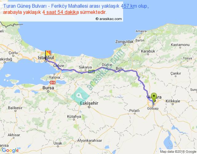 Turan Güneş Bulvarı - Feriköy Mahallesi arası yaklaşık olarak 90 km/h ile yukarıda belirtilen sürede olup, iki yerin kuş uçuşu uzaklığı (mesafesi) 351'dir. Eğer belirtilen yerler arasında uçak seferi var ise bu süre uçakla 32 dakika'ya kadar düşebilir. Yolculuk otobüsle 6 saat 22 dakika sürmektedir.