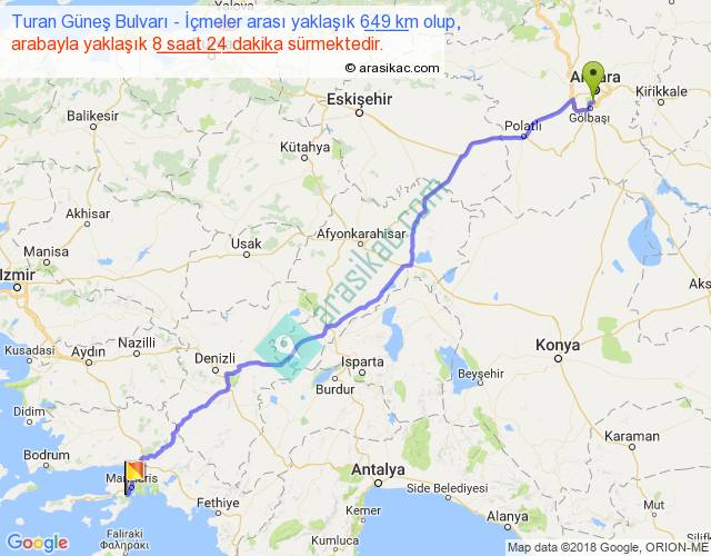 Turan Güneş Bulvarı - İçmeler arası yaklaşık olarak 90 km/h ile yukarıda belirtilen sürede olup, iki yerin kuş uçuşu uzaklığı (mesafesi) 523'dir. Eğer belirtilen yerler arasında uçak seferi var ise bu süre uçakla 48 dakika'ya kadar düşebilir. Yolculuk otobüsle 10 saat 55 dakika sürmektedir.