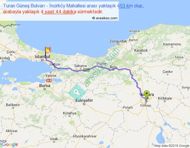 Turan Güneş Bulvarı - İncirköy Mahallesi arası yaklaşık olarak 90 km/h ile yukarıda belirtilen sürede olup, iki yerin kuş uçuşu uzaklığı (mesafesi) 344'dir. Eğer belirtilen yerler arasında uçak seferi var ise bu süre uçakla 31 dakika'ya kadar düşebilir. Yolculuk otobüsle 6 saat 9 dakika sürmektedir.