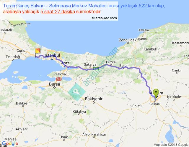 Turan Güneş Bulvarı - Selimpaşa Merkez Mahallesi arası yaklaşık olarak 90 km/h ile yukarıda belirtilen sürede olup, iki yerin kuş uçuşu uzaklığı (mesafesi) 400'dir. Eğer belirtilen yerler arasında uçak seferi var ise bu süre uçakla 36 dakika'ya kadar düşebilir. Yolculuk otobüsle 7 saat 5 dakika sürmektedir.