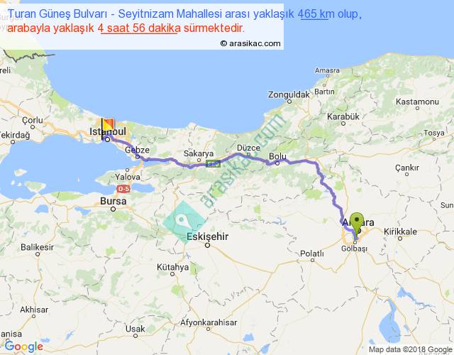 Turan Güneş Bulvarı - Seyitnizam Mahallesi arası yaklaşık olarak 90 km/h ile yukarıda belirtilen sürede olup, iki yerin kuş uçuşu uzaklığı (mesafesi) 355'dir. Eğer belirtilen yerler arasında uçak seferi var ise bu süre uçakla 32 dakika'ya kadar düşebilir. Yolculuk otobüsle 6 saat 24 dakika sürmektedir.