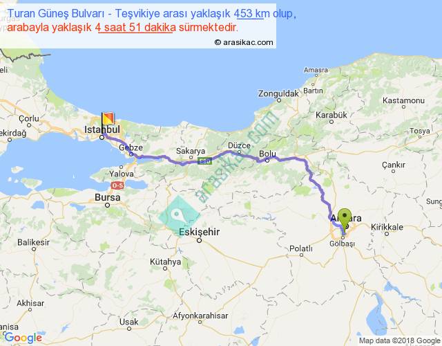 Turan Güneş Bulvarı - Teşvikiye arası yaklaşık olarak 90 km/h ile yukarıda belirtilen sürede olup, iki yerin kuş uçuşu uzaklığı (mesafesi) 349'dir. Eğer belirtilen yerler arasında uçak seferi var ise bu süre uçakla 32 dakika'ya kadar düşebilir. Yolculuk otobüsle 6 saat 18 dakika sürmektedir.