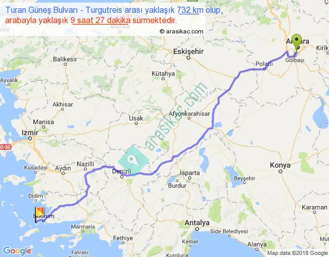 Turan Güneş Bulvarı - Turgutreis arası yaklaşık olarak 90 km/h ile yukarıda belirtilen sürede olup, iki yerin kuş uçuşu uzaklığı (mesafesi) 575'dir. Eğer belirtilen yerler arasında uçak seferi var ise bu süre uçakla 53 dakika'ya kadar düşebilir. Yolculuk otobüsle 12 saat 17 dakika sürmektedir.