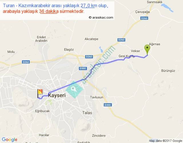 Turan - Kazımkarabekir arası yaklaşık olarak 90 km/h ile yukarıda belirtilen sürede olup, iki yerin kuş uçuşu uzaklığı (mesafesi) 24'dir. Yolculuk otobüsle 46 dakika sürmektedir.