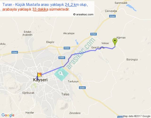 Turan - Küçük Mustafa arası yaklaşık olarak 90 km/h ile yukarıda belirtilen sürede olup, iki yerin kuş uçuşu uzaklığı (mesafesi) 21'dir. Yolculuk otobüsle 42 dakika sürmektedir.