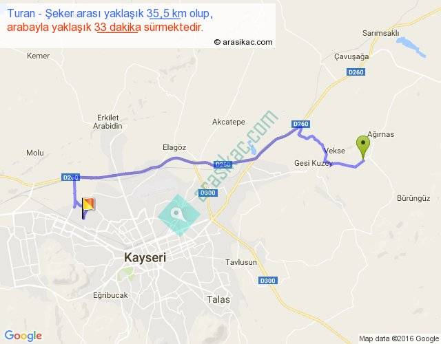 Turan - Şeker arası yaklaşık olarak 90 km/h ile yukarıda belirtilen sürede olup, iki yerin kuş uçuşu uzaklığı (mesafesi) 25'dir. Yolculuk otobüsle 42 dakika sürmektedir.