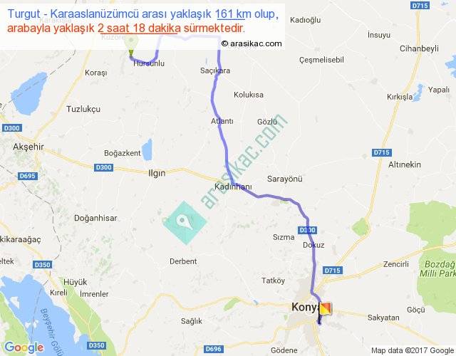 Turgut - Karaaslanüzümcü arası yaklaşık olarak 90 km/h ile yukarıda belirtilen sürede olup, iki yerin kuş uçuşu uzaklığı (mesafesi) 109'dir. Yolculuk otobüsle 2 saat 59 dakika sürmektedir.