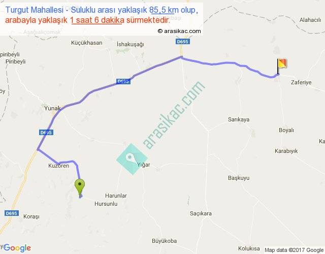 Turgut Mahallesi - Suluklu arası yaklaşık olarak 90 km/h ile yukarıda belirtilen sürede olup, iki yerin kuş uçuşu uzaklığı (mesafesi) 55'dir. Yolculuk otobüsle 1 saat 25 dakika sürmektedir.