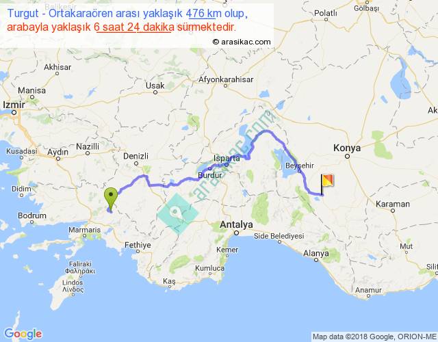 Turgut - Ortakaraören arası yaklaşık olarak 90 km/h ile yukarıda belirtilen sürede olup, iki yerin kuş uçuşu uzaklığı (mesafesi) 300'dir. Eğer belirtilen yerler arasında uçak seferi var ise bu süre uçakla 27 dakika'ya kadar düşebilir. Yolculuk otobüsle 8 saat 19 dakika sürmektedir.