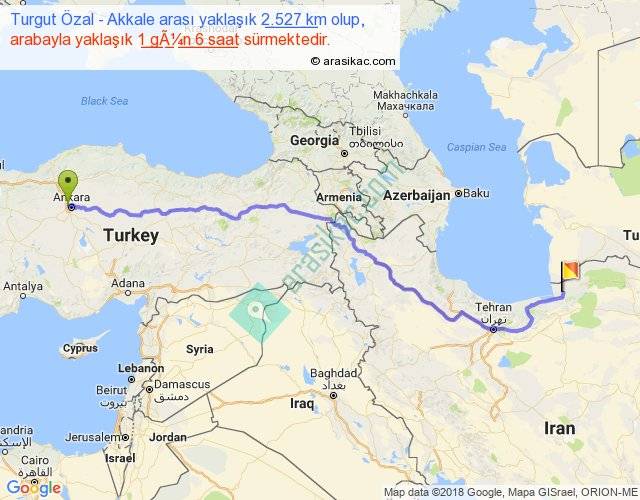 Turgut Özal - Akkale arası yaklaşık olarak 90 km/h ile yukarıda belirtilen sürede olup, iki yerin kuş uçuşu uzaklığı (mesafesi) 1905'dir. Eğer belirtilen yerler arasında uçak seferi var ise bu süre uçakla 2 saat 55 dakika'ya kadar düşebilir. Yolculuk otobüsle 1 gün 15 saat sürmektedir.