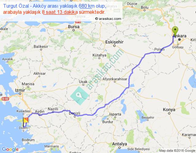 Turgut Özal - Akköy arası yaklaşık olarak 90 km/h ile yukarıda belirtilen sürede olup, iki yerin kuş uçuşu uzaklığı (mesafesi) 545'dir. Eğer belirtilen yerler arasında uçak seferi var ise bu süre uçakla 50 dakika'ya kadar düşebilir. Yolculuk otobüsle 10 saat 40 dakika sürmektedir.