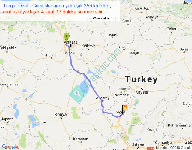Turgut Özal - Gümüşler arası yaklaşık olarak 90 km/h ile yukarıda belirtilen sürede olup, iki yerin kuş uçuşu uzaklığı (mesafesi) 283'dir. Eğer belirtilen yerler arasında uçak seferi var ise bu süre uçakla 26 dakika'ya kadar düşebilir. Yolculuk otobüsle 5 saat 28 dakika sürmektedir.
