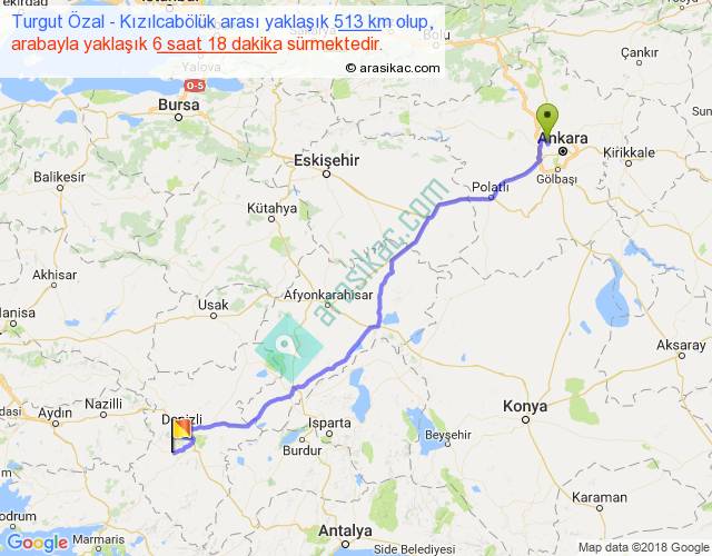 Turgut Özal - Kızılcabölük arası yaklaşık olarak 90 km/h ile yukarıda belirtilen sürede olup, iki yerin kuş uçuşu uzaklığı (mesafesi) 413'dir. Eğer belirtilen yerler arasında uçak seferi var ise bu süre uçakla 38 dakika'ya kadar düşebilir. Yolculuk otobüsle 8 saat 11 dakika sürmektedir.