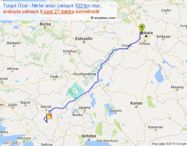 Turgut Özal - Nikfer arası yaklaşık olarak 90 km/h ile yukarıda belirtilen sürede olup, iki yerin kuş uçuşu uzaklığı (mesafesi) 420'dir. Eğer belirtilen yerler arasında uçak seferi var ise bu süre uçakla 38 dakika'ya kadar düşebilir. Yolculuk otobüsle 8 saat 23 dakika sürmektedir.