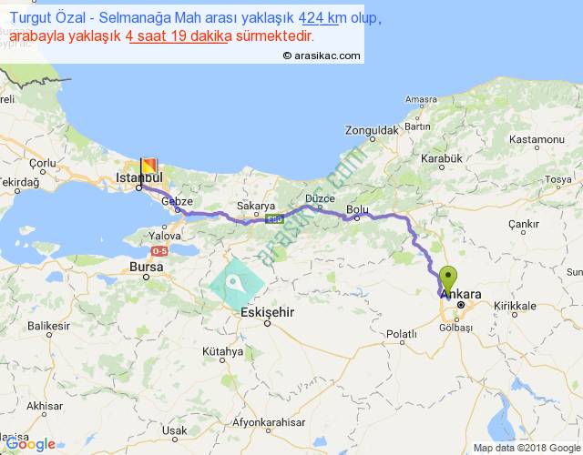 Turgut Özal - Selmanağa Mah arası yaklaşık olarak 90 km/h ile yukarıda belirtilen sürede olup, iki yerin kuş uçuşu uzaklığı (mesafesi) 331'dir. Eğer belirtilen yerler arasında uçak seferi var ise bu süre uçakla 30 dakika'ya kadar düşebilir. Yolculuk otobüsle 5 saat 36 dakika sürmektedir.