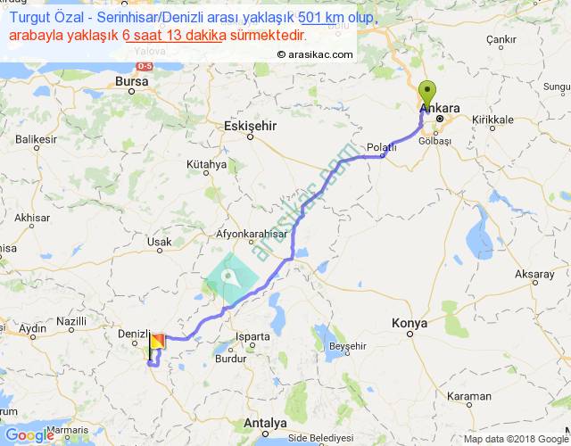 Turgut Özal - Serinhisar Denizli arası yaklaşık olarak 90 km/h ile yukarıda belirtilen sürede olup, iki yerin kuş uçuşu uzaklığı (mesafesi) 394'dir. Eğer belirtilen yerler arasında uçak seferi var ise bu süre uçakla 36 dakika'ya kadar düşebilir. Yolculuk otobüsle 8 saat 4 dakika sürmektedir.