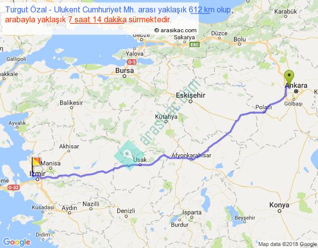 Turgut Özal - Ulukent Cumhuriyet Mh. arası yaklaşık olarak 90 km/h ile yukarıda belirtilen sürede olup, iki yerin kuş uçuşu uzaklığı (mesafesi) 511'dir. Eğer belirtilen yerler arasında uçak seferi var ise bu süre uçakla 47 dakika'ya kadar düşebilir. Yolculuk otobüsle 9 saat 24 dakika sürmektedir.