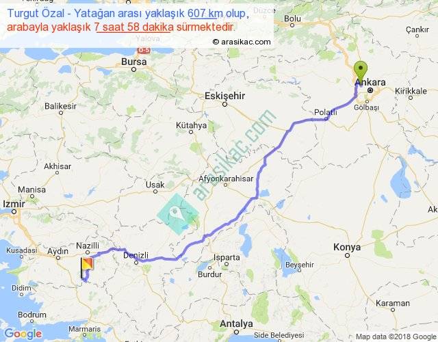 Turgut Özal - Yatağan arası yaklaşık olarak 90 km/h ile yukarıda belirtilen sürede olup, iki yerin kuş uçuşu uzaklığı (mesafesi) 468'dir. Eğer belirtilen yerler arasında uçak seferi var ise bu süre uçakla 43 dakika'ya kadar düşebilir. Yolculuk otobüsle 10 saat 21 dakika sürmektedir.