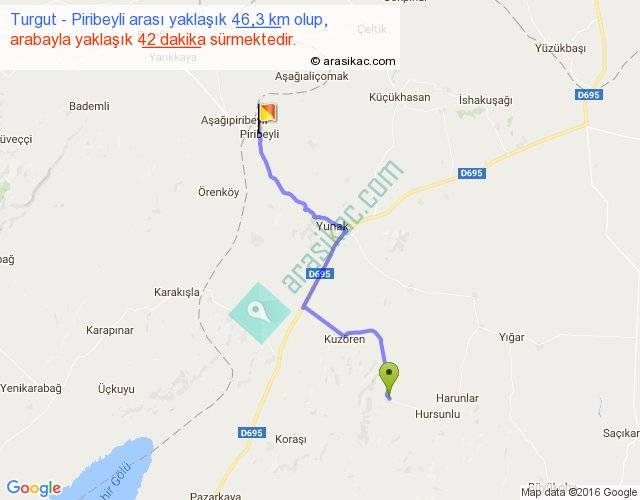 Turgut - Piribeyli arası yaklaşık olarak 90 km/h ile yukarıda belirtilen sürede olup, iki yerin kuş uçuşu uzaklığı (mesafesi) 35'dir. Yolculuk otobüsle 54 dakika sürmektedir.