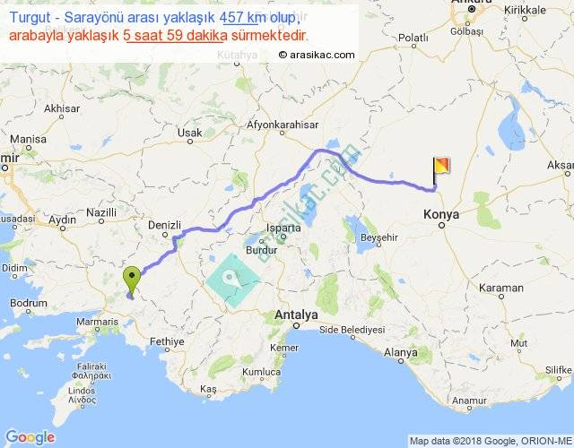 Turgut - Sarayönü arası yaklaşık olarak 90 km/h ile yukarıda belirtilen sürede olup, iki yerin kuş uçuşu uzaklığı (mesafesi) 347'dir. Eğer belirtilen yerler arasında uçak seferi var ise bu süre uçakla 32 dakika'ya kadar düşebilir. Yolculuk otobüsle 7 saat 46 dakika sürmektedir.