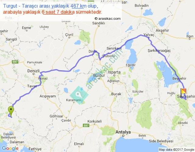 Turgut - Taraşcı arası yaklaşık olarak 90 km/h ile yukarıda belirtilen sürede olup, iki yerin kuş uçuşu uzaklığı (mesafesi) 272'dir. Eğer belirtilen yerler arasında uçak seferi var ise bu süre uçakla 25 dakika'ya kadar düşebilir. Yolculuk otobüsle 7 saat 57 dakika sürmektedir.