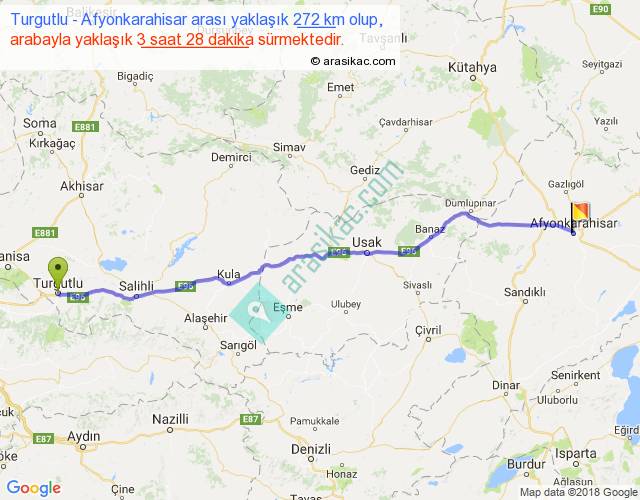 Turgutlu - Afyonkarahisar arası yaklaşık olarak 90 km/h ile yukarıda belirtilen sürede olup, iki yerin kuş uçuşu uzaklığı (mesafesi) 246'dir. Yolculuk otobüsle 4 saat 25 dakika sürmektedir.