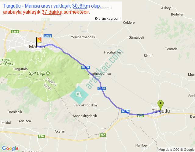 Turgutlu - Manisa arası yaklaşık olarak 90 km/h ile yukarıda belirtilen sürede olup, iki yerin kuş uçuşu uzaklığı (mesafesi) 27'dir. Yolculuk otobüsle 49 dakika sürmektedir.