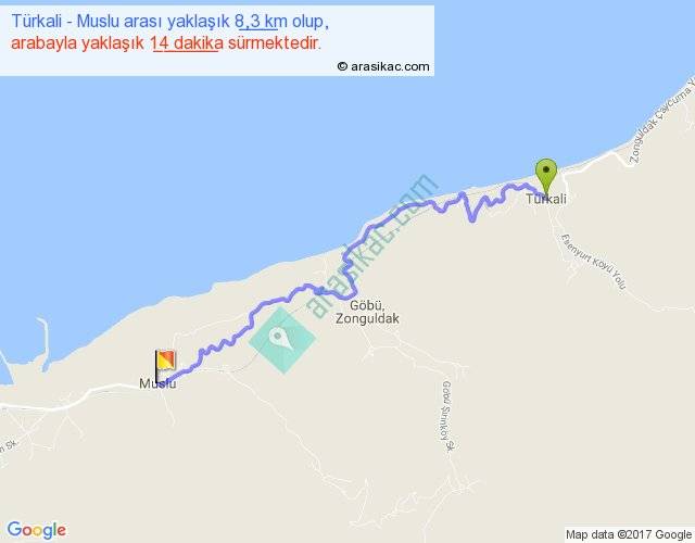 Türkali - Muslu arası yaklaşık olarak 90 km/h ile yukarıda belirtilen sürede olup, iki yerin kuş uçuşu uzaklığı (mesafesi) 6'dir. Yolculuk otobüsle 18 dakika sürmektedir.
