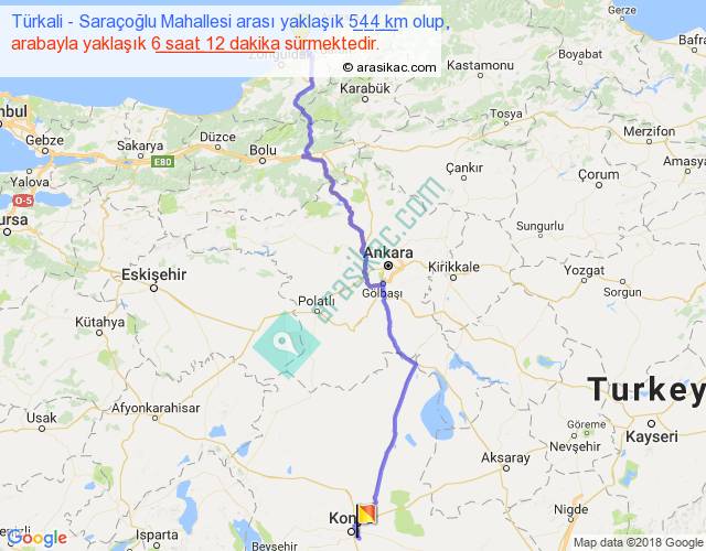 Türkali - Saraçoğlu Mahallesi arası yaklaşık olarak 90 km/h ile yukarıda belirtilen sürede olup, iki yerin kuş uçuşu uzaklığı (mesafesi) 414'dir. Eğer belirtilen yerler arasında uçak seferi var ise bu süre uçakla 38 dakika'ya kadar düşebilir. Yolculuk otobüsle 8 saat 3 dakika sürmektedir.