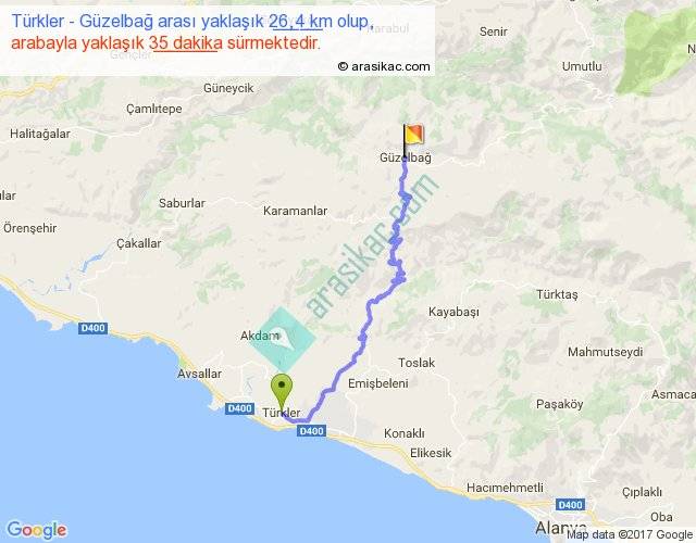 Türkler - Güzelbağ arası yaklaşık olarak 90 km/h ile yukarıda belirtilen sürede olup, iki yerin kuş uçuşu uzaklığı (mesafesi) 16'dir. Yolculuk otobüsle 45 dakika sürmektedir.