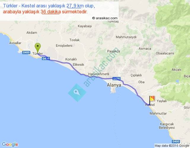 Türkler - Kestel arası yaklaşık olarak 90 km/h ile yukarıda belirtilen sürede olup, iki yerin kuş uçuşu uzaklığı (mesafesi) 25'dir. Yolculuk otobüsle 46 dakika sürmektedir.