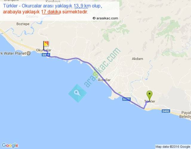 Türkler - Okurcalar arası yaklaşık olarak 90 km/h ile yukarıda belirtilen sürede olup, iki yerin kuş uçuşu uzaklığı (mesafesi) 12'dir. Yolculuk otobüsle 22 dakika sürmektedir.