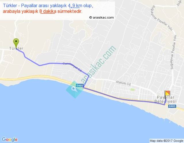 Türkler - Payallar arası yaklaşık olarak 90 km/h ile yukarıda belirtilen sürede olup, iki yerin kuş uçuşu uzaklığı (mesafesi) 4'dir. Yolculuk otobüsle 10 dakika sürmektedir.