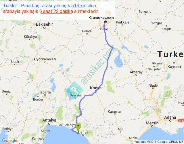 Türkler - Pınarbaşı arası yaklaşık olarak 90 km/h ile yukarıda belirtilen sürede olup, iki yerin kuş uçuşu uzaklığı (mesafesi) 386'dir. Eğer belirtilen yerler arasında uçak seferi var ise bu süre uçakla 35 dakika'ya kadar düşebilir. Yolculuk otobüsle 8 saat 16 dakika sürmektedir.