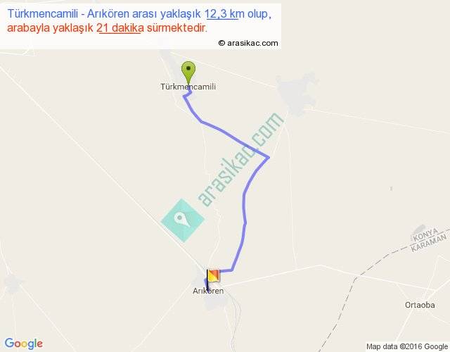 Türkmencamili - Arıkören arası yaklaşık olarak 90 km/h ile yukarıda belirtilen sürede olup, iki yerin kuş uçuşu uzaklığı (mesafesi) 9'dir. Yolculuk otobüsle 27 dakika sürmektedir.