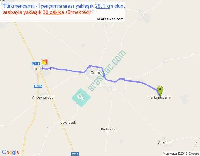 Türkmencamili - İçeriçumra arası yaklaşık olarak 90 km/h ile yukarıda belirtilen sürede olup, iki yerin kuş uçuşu uzaklığı (mesafesi) 23'dir. Yolculuk otobüsle 39 dakika sürmektedir.