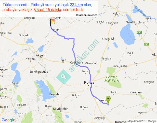 Türkmencamili - Piribeyli arası yaklaşık olarak 90 km/h ile yukarıda belirtilen sürede olup, iki yerin kuş uçuşu uzaklığı (mesafesi) 189'dir. Yolculuk otobüsle 4 saat 13 dakika sürmektedir.