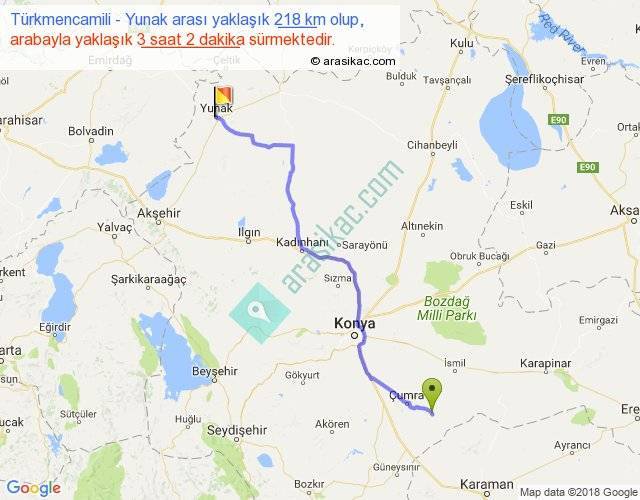 Türkmencamili - Yunak arası yaklaşık olarak 90 km/h ile yukarıda belirtilen sürede olup, iki yerin kuş uçuşu uzaklığı (mesafesi) 175'dir. Yolculuk otobüsle 3 saat 56 dakika sürmektedir.