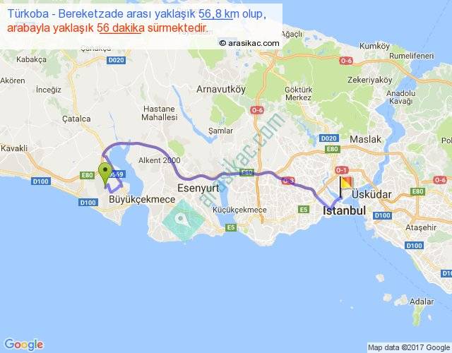 Türkoba - Bereketzade arası yaklaşık olarak 90 km/h ile yukarıda belirtilen sürede olup, iki yerin kuş uçuşu uzaklığı (mesafesi) 38'dir. Yolculuk otobüsle 1 saat 12 dakika sürmektedir.