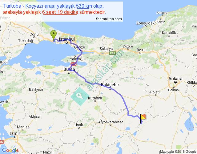 Türkoba - Koçyazı arası yaklaşık olarak 90 km/h ile yukarıda belirtilen sürede olup, iki yerin kuş uçuşu uzaklığı (mesafesi) 363'dir. Eğer belirtilen yerler arasında uçak seferi var ise bu süre uçakla 33 dakika'ya kadar düşebilir. Yolculuk otobüsle 8 saat 12 dakika sürmektedir.
