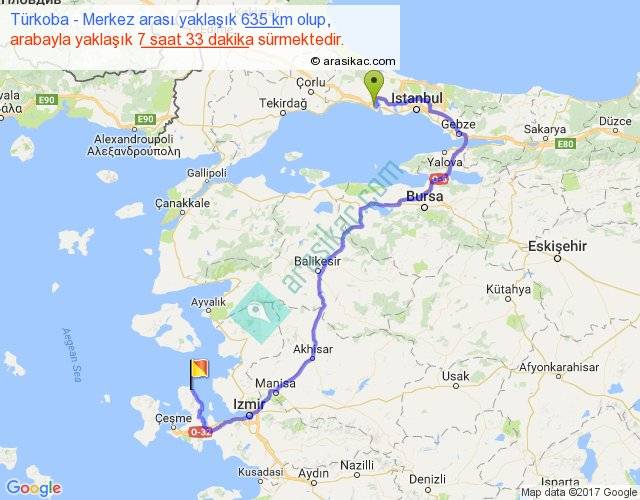 Türkoba - Merkez arası yaklaşık olarak 90 km/h ile yukarıda belirtilen sürede olup, iki yerin kuş uçuşu uzaklığı (mesafesi) 315'dir. Eğer belirtilen yerler arasında uçak seferi var ise bu süre uçakla 29 dakika'ya kadar düşebilir. Yolculuk otobüsle 9 saat 48 dakika sürmektedir.