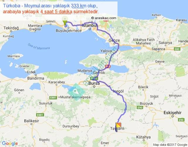 Türkoba - Moymul arası yaklaşık olarak 90 km/h ile yukarıda belirtilen sürede olup, iki yerin kuş uçuşu uzaklığı (mesafesi) 184'dir. Yolculuk otobüsle 5 saat 18 dakika sürmektedir.
