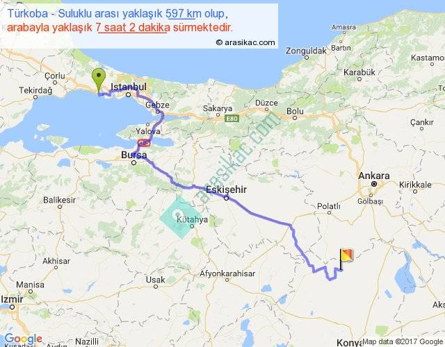 Türkoba - Suluklu arası yaklaşık olarak 90 km/h ile yukarıda belirtilen sürede olup, iki yerin kuş uçuşu uzaklığı (mesafesi) 403'dir. Eğer belirtilen yerler arasında uçak seferi var ise bu süre uçakla 37 dakika'ya kadar düşebilir. Yolculuk otobüsle 9 saat 8 dakika sürmektedir.