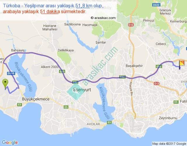 Türkoba - Yeşilpınar arası yaklaşık olarak 90 km/h ile yukarıda belirtilen sürede olup, iki yerin kuş uçuşu uzaklığı (mesafesi) 34'dir. Yolculuk otobüsle 1 saat 6 dakika sürmektedir.