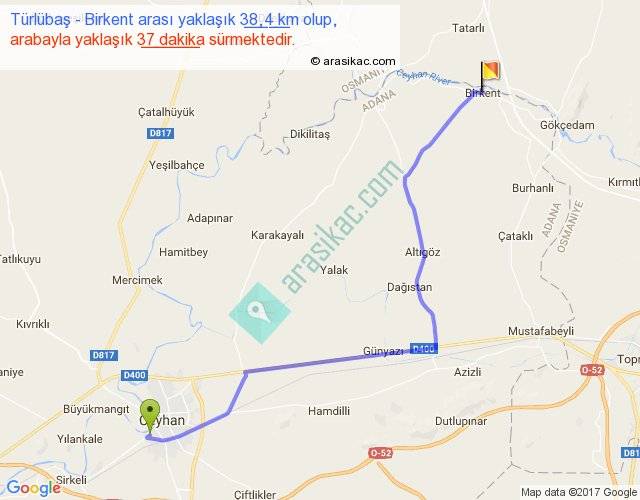 Türlübaş - Birkent arası yaklaşık olarak 90 km/h ile yukarıda belirtilen sürede olup, iki yerin kuş uçuşu uzaklığı (mesafesi) 29'dir. Yolculuk otobüsle 48 dakika sürmektedir.