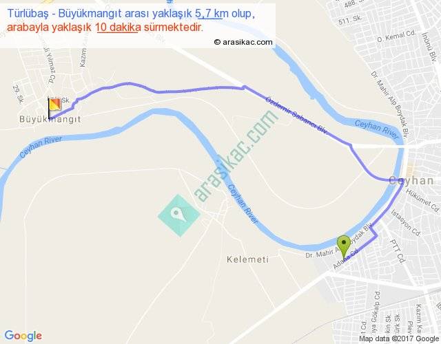 Türlübaş - Büyükmangıt arası yaklaşık olarak 90 km/h ile yukarıda belirtilen sürede olup, iki yerin kuş uçuşu uzaklığı (mesafesi) 4'dir. Yolculuk otobüsle 13 dakika sürmektedir.