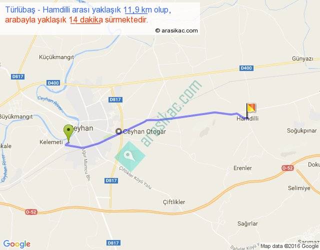 Türlübaş - Hamdilli arası yaklaşık olarak 90 km/h ile yukarıda belirtilen sürede olup, iki yerin kuş uçuşu uzaklığı (mesafesi) 11'dir. Yolculuk otobüsle 18 dakika sürmektedir.