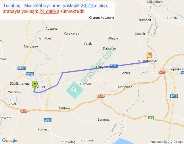 Türlübaş - Mustafabeyli arası yaklaşık olarak 90 km/h ile yukarıda belirtilen sürede olup, iki yerin kuş uçuşu uzaklığı (mesafesi) 25'dir. Yolculuk otobüsle 31 dakika sürmektedir.