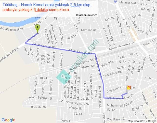 Türlübaş - Namık Kemal arası yaklaşık olarak 90 km/h ile yukarıda belirtilen sürede olup, iki yerin kuş uçuşu uzaklığı (mesafesi) 2'dir. Yolculuk otobüsle 7 dakika sürmektedir.